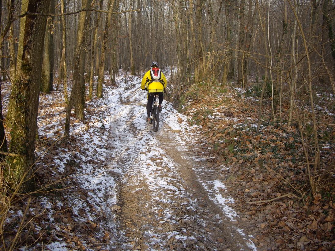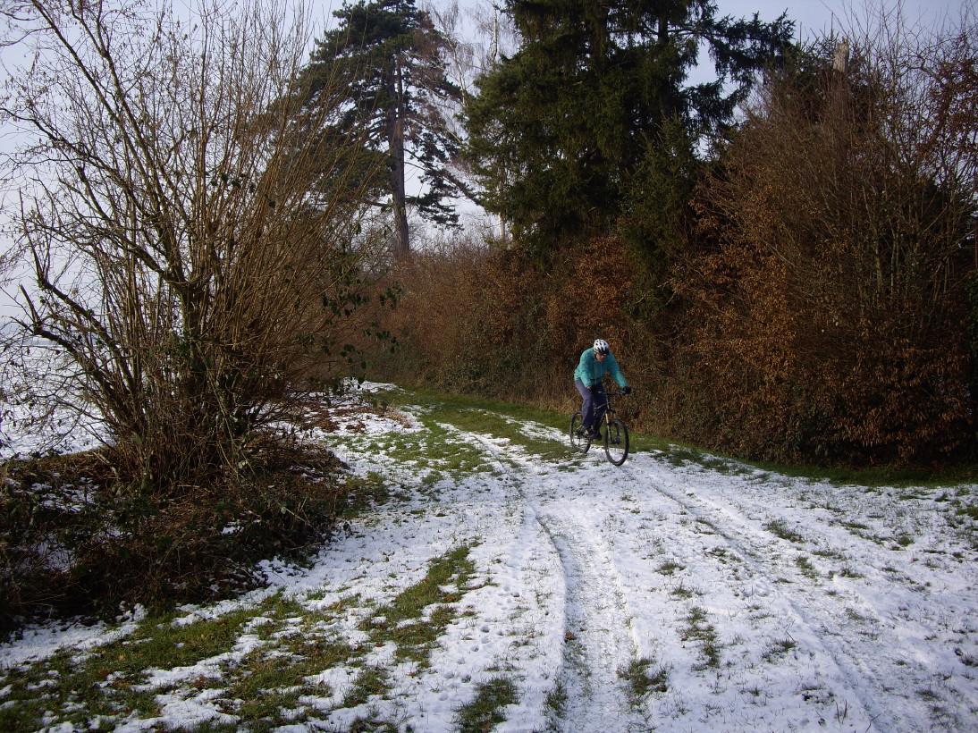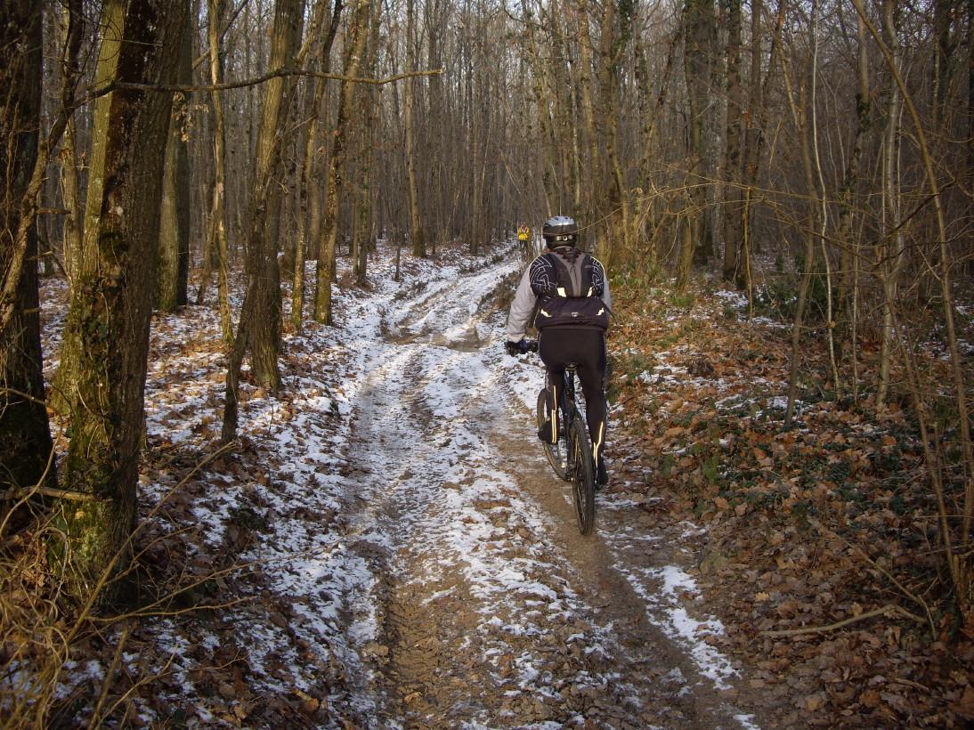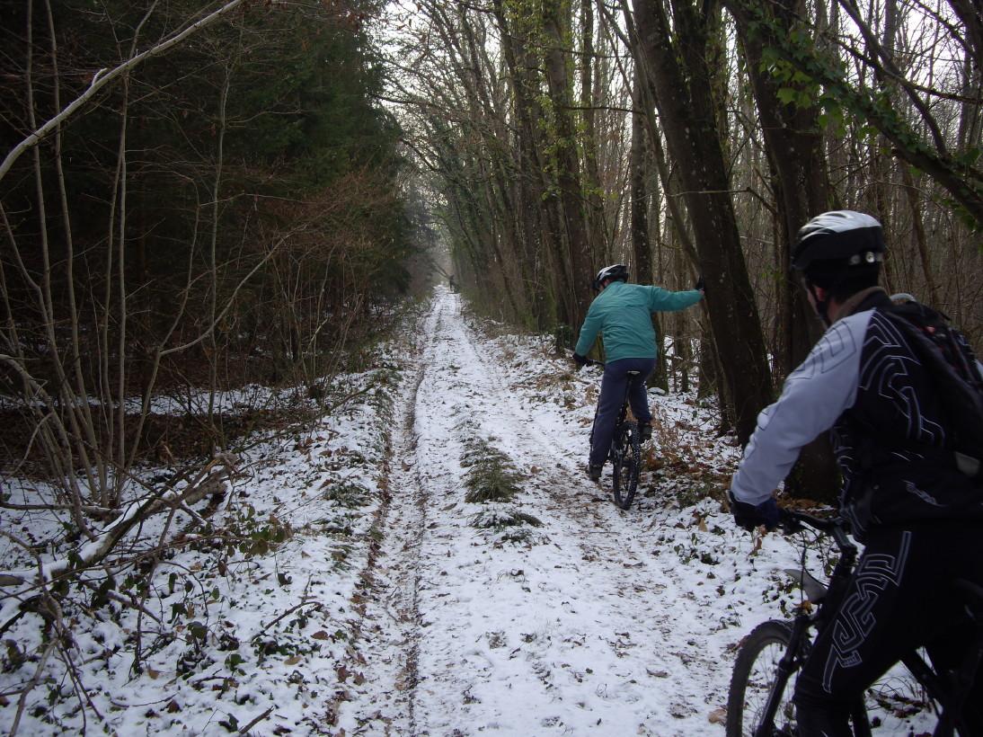 En même temps y a des gens qui bossent la semaine (hein Bull?). Moi c'est vrai que j'étais pas épuisé par ma semine de boulot!!!!!!!! Merci la neige! Neige encore bien présente tout au long de notre balade. Du coup, même les portions de route ressemblaient à des chemins. Le tout rendant bien sympathique les paysages...et ne salissant pas les vtt (ça sera pas le cas dimanche prochain avec le dégel!)